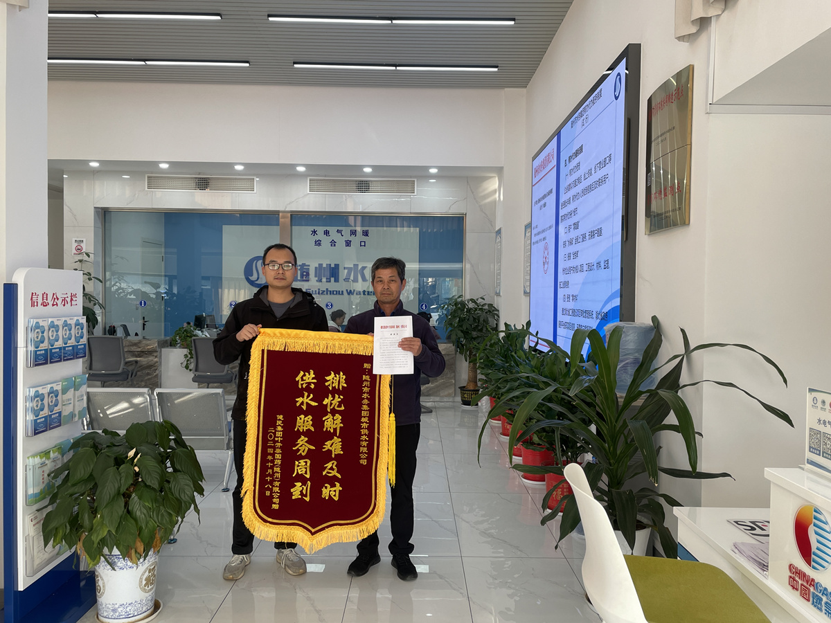 錦旗和感謝信不僅承載的是企業(yè)用戶的感激,更是對隨州水務(wù)為企業(yè)辦實事、辦好事的信任和鼓勵。群眾利益無小事!隨州水務(wù)將持續(xù)增強主動服務(wù)意識,聚焦企業(yè)用水的“難點、堵點、痛點”問題,強化擔(dān)當(dāng)、主動作為,持續(xù)秉持初心,想群眾之所想,急企業(yè)之所急,以更加飽滿的熱情、更加高效的執(zhí)行力、更加貼心優(yōu)質(zhì)的服務(wù),助力打造一流用水環(huán)境。