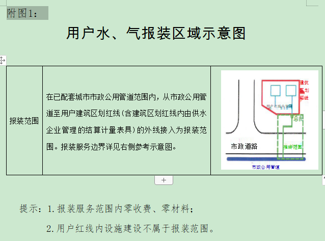 在已配套城市市政公用管道范圍內(nèi),從市政公用管道至用戶建筑區(qū)劃紅線的外線接入為報裝范圍。供水、供氣企業(yè)的投資界面必須延伸至用戶建筑區(qū)劃紅線,紅線外連接工程由供水、供氣企業(yè)負(fù)責(zé),用戶“零成本”不需要投資。施工結(jié)束后,供水、供氣企業(yè)按指定標(biāo)準(zhǔn)恢復(fù)市政道路和園林綠化。