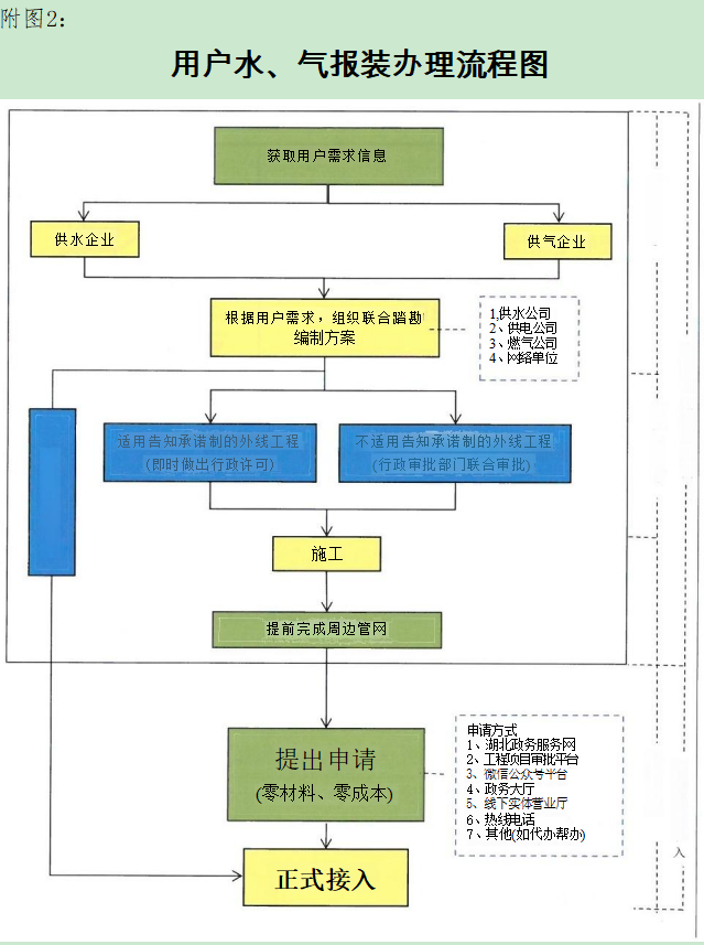 (一)免費申請。 用戶通過政務(wù)服務(wù)網(wǎng)、供水供氣網(wǎng)上營業(yè)廳、微信公眾號、各營業(yè)網(wǎng)點等方式提出用水用氣接入申請。